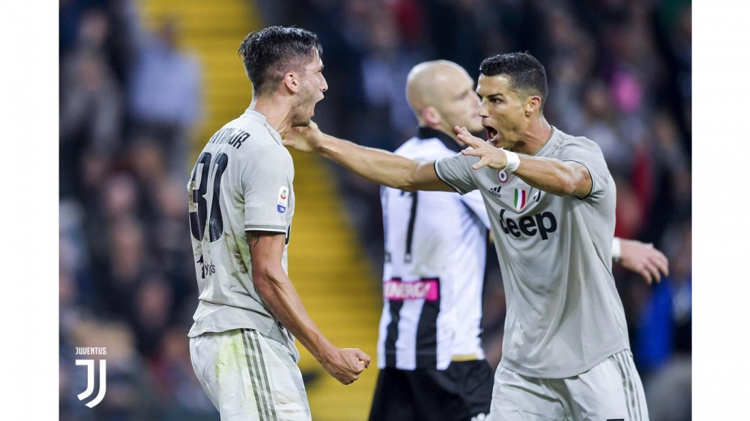 Og Juve tok umiddelbart kommandoen i oppgjøret. Ballen ble effektivt sirkulert, og det var bare et tidsspørsmål før nullen bak en for kvelden strålende Simone Scuffet skulle sprekke. Juventus hadde flere muligheter til å score kampens første mål, men det ville seg ikke helt. Først og fremst leverte Simone Scuffet en kamp som viste hvorfor han for noen år siden ble sett på som verdens kanskje største keepertalent. Men det kunne ikke vare evig, og etter en drøy halvtime røk smultringen. Udinese har etter en sjelden offensiv visitt vunnet en corner, som svinges rett i klypene til Wojciech Szczensy. Polakken setter igang en kontring, og kula havner hos Dybala på midten av banen. Med en mann i rygg og vendt hjemover serverer juvelen en nydelig vending, og finner Cancelo på tur oppover høyresida. Cancelo titter opp, og sender et strøkent innlegg mot midten av feltet, der Cristiano Ronaldo befant seg. Men først på ball var Rodrigo Bentancur som hadde tatt et sugende løp fremover! Uruguayaneren stanger kula i mål rett foran Ronaldo, og kunne dermed feire sitt første mål for Juventus! Og førstemann til å gratulere var Cristiano Ronaldo, som var genuint glad på Bentancurs vegne. Tidligere har man sett Ronaldo irritere seg over at andre tok «hans» mål, men ikke nå. Det er bra stemning i Juve om dagen! Og Cristiano trengte bare å vente noen få minutter før han kunne feire eget mål.